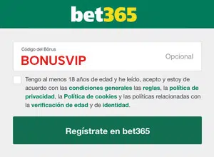 Cuando abras el formulario de registro en bet365, además de encontrar campos para introducir tus datos personales también verás uno para insertar el código bonus. Será entonces cuando podrás copiar y pegar el código ‘BONUSVIP’ para completar tu alta como nuevo cliente con esta referencia.